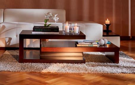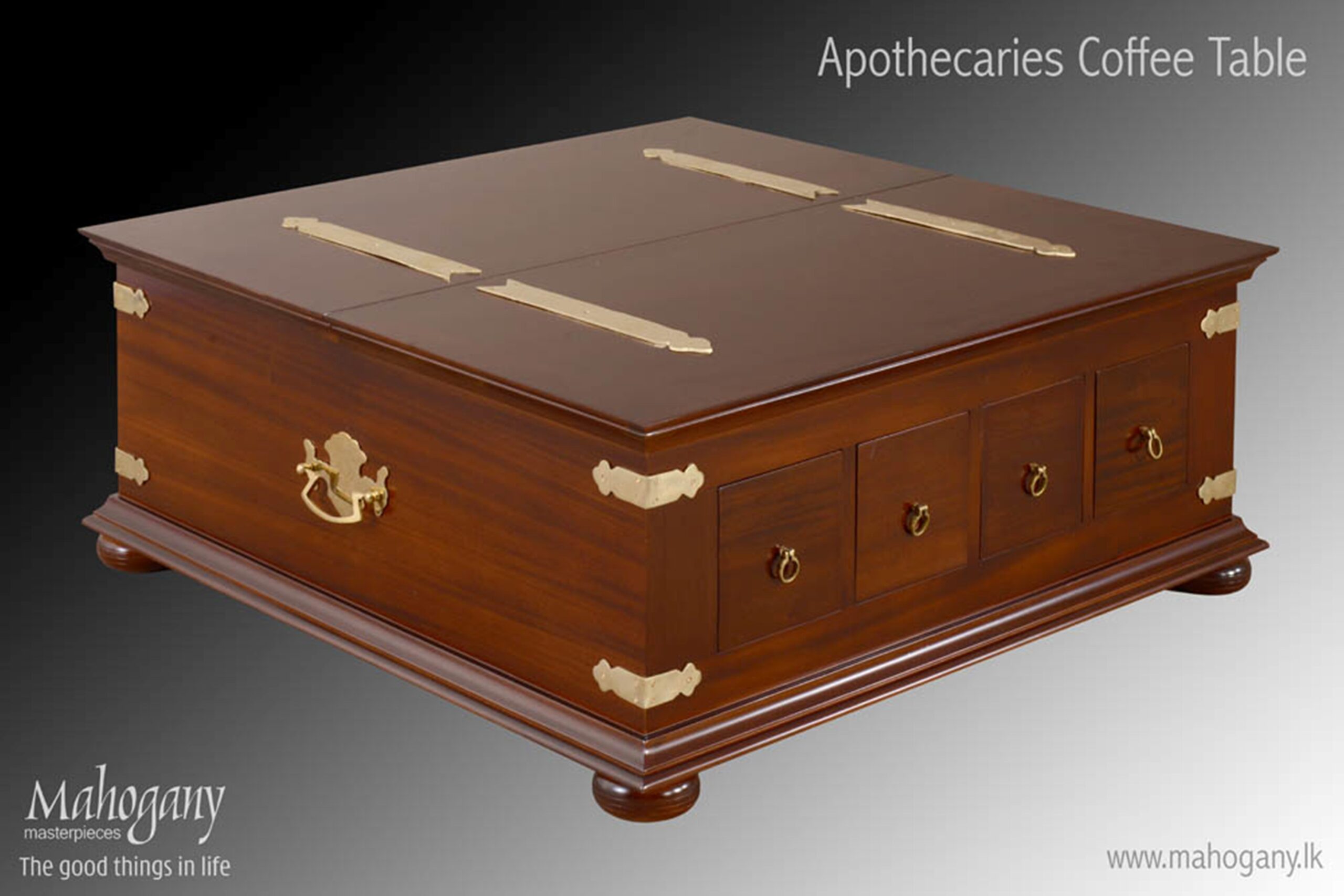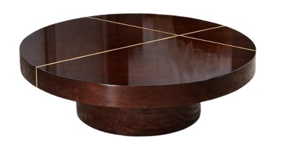 This very contemporary coffee table is both elegant and functional with satin wood inlays and storage cavities on either side.