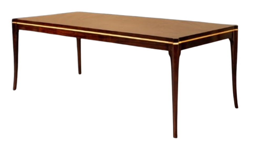 This stunning dining table is a true example of fine craftsmanship. The solid mahogany, stain-resistant top brings out the lustre of the natural grain and features two elegant brass inlay strips on either side. The base features solid mahogany legs with brass capping.