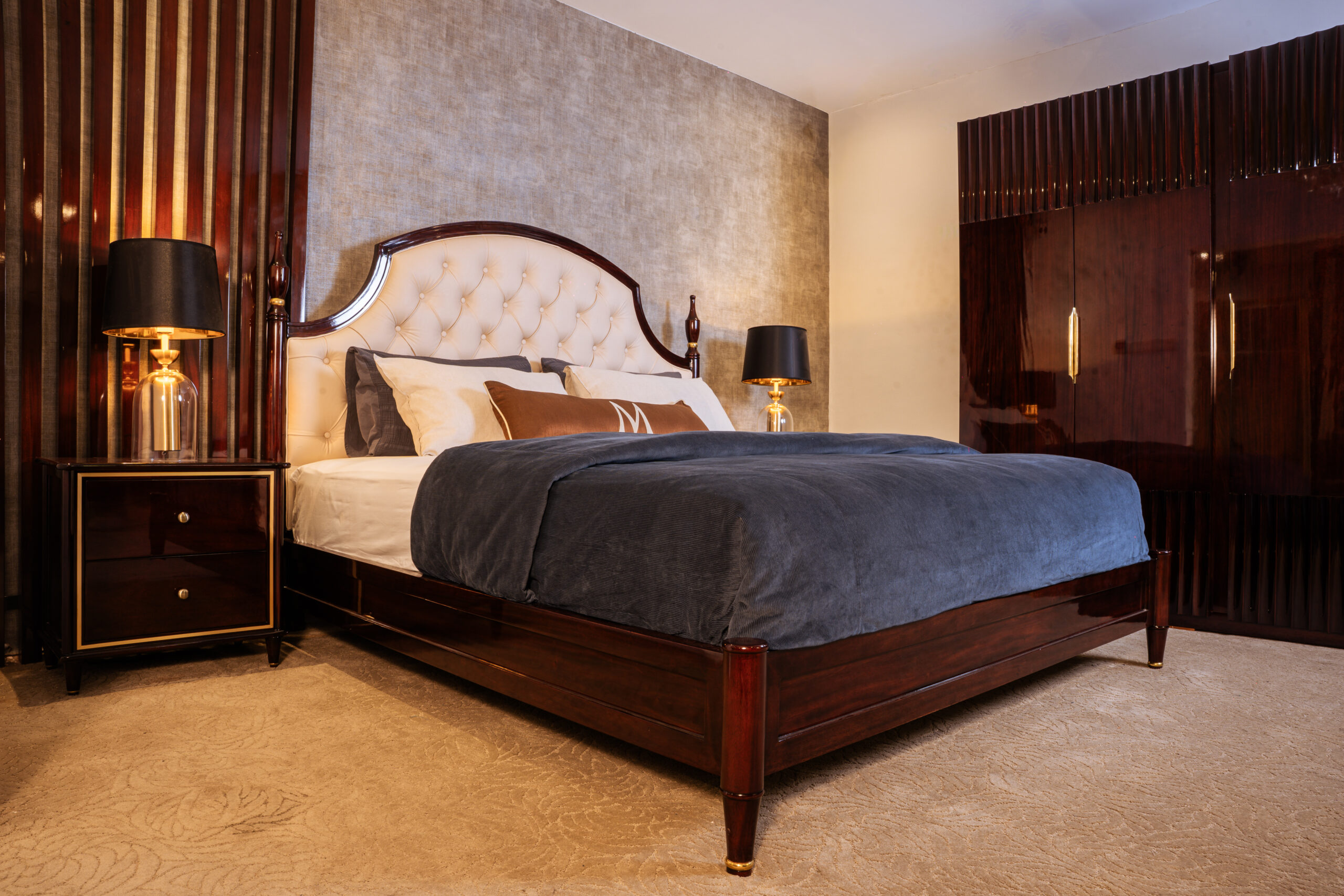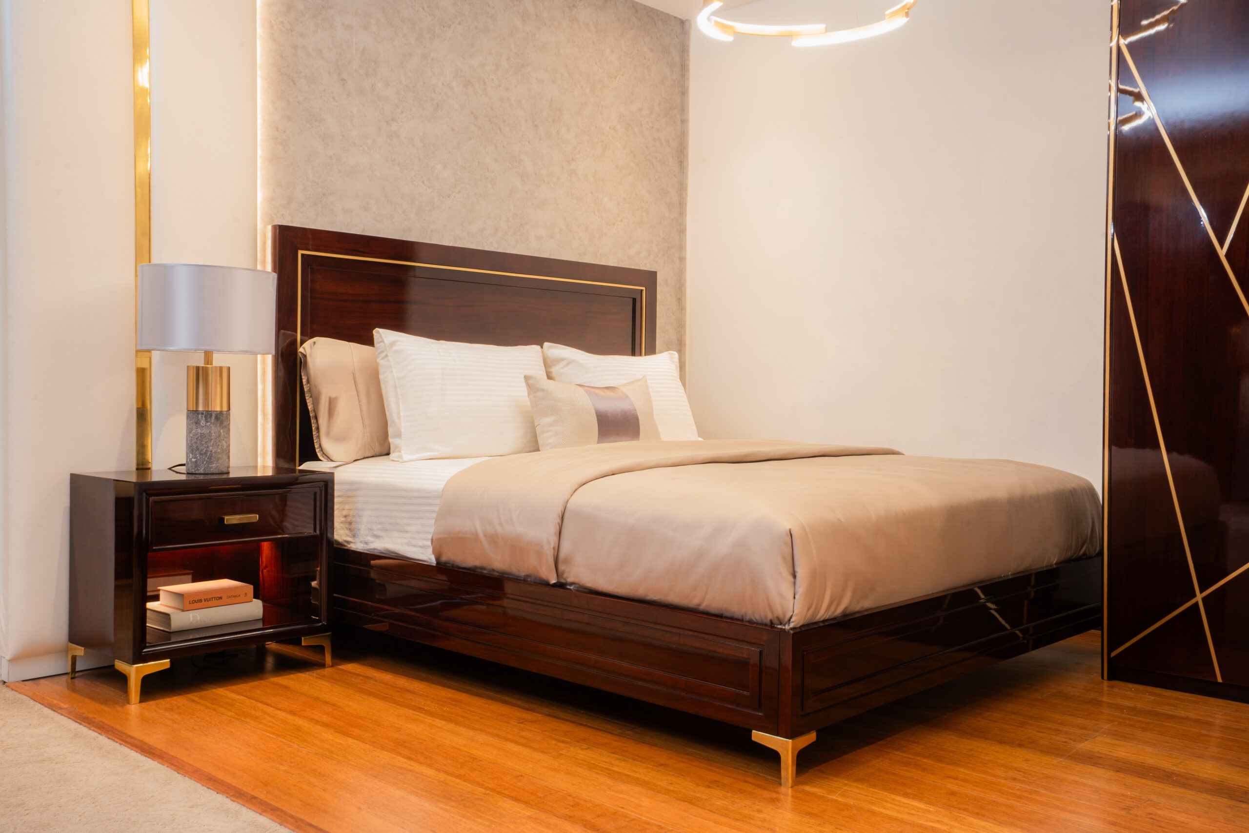 This luxurious bed adds glamour to the bedroom with plush fabric and a solid brass frame leg at the base.