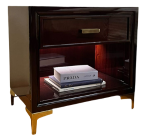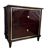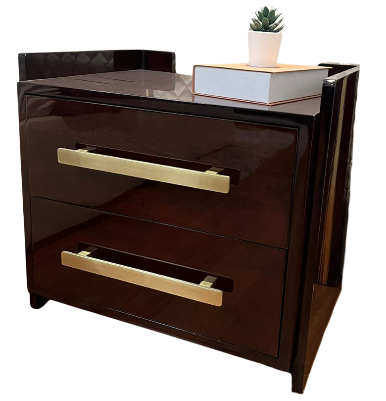 This art décor design features upholstered facia with touch sensitive functionality for the drawers and solid brass end caps on the legs.