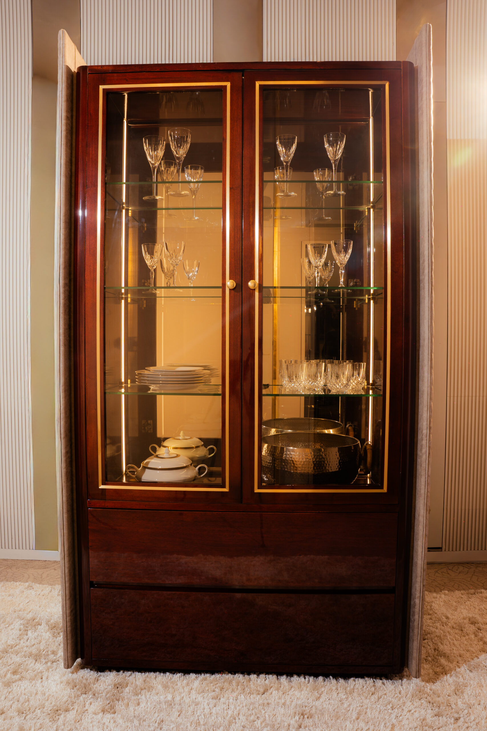 This Art Décor deign is a contemporary work of art with its contoured and upholstered doors with touch sensitive functionality and brass filigree.