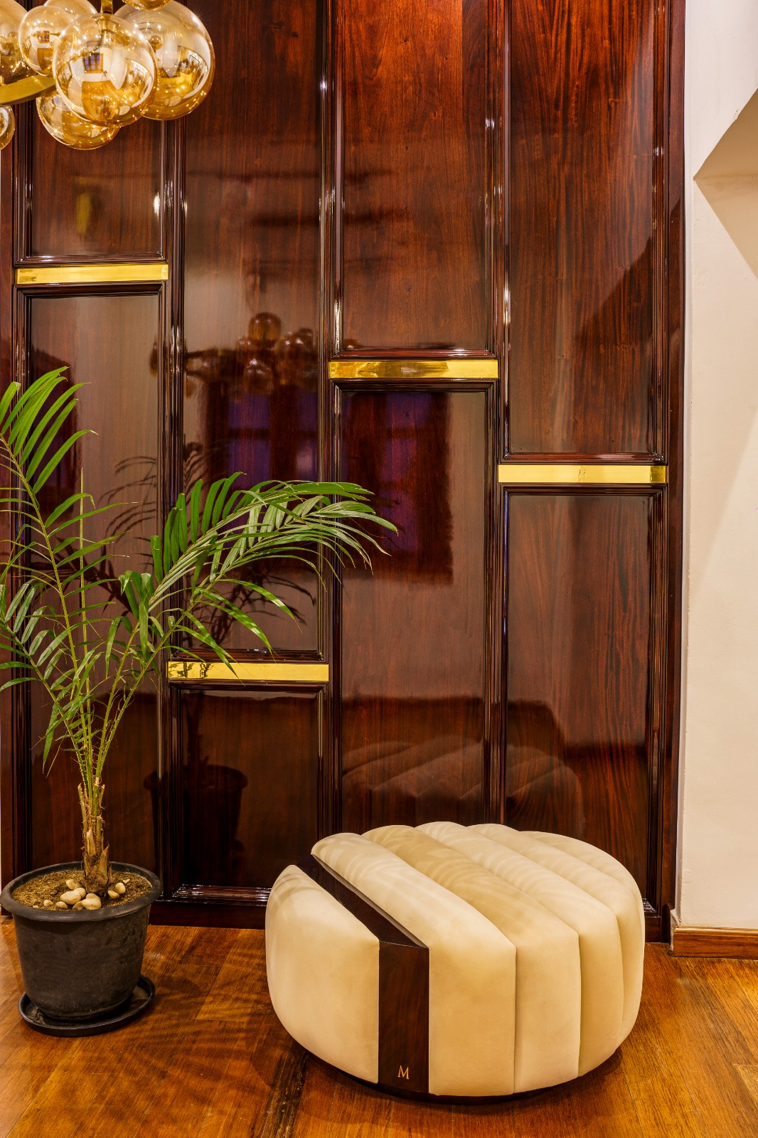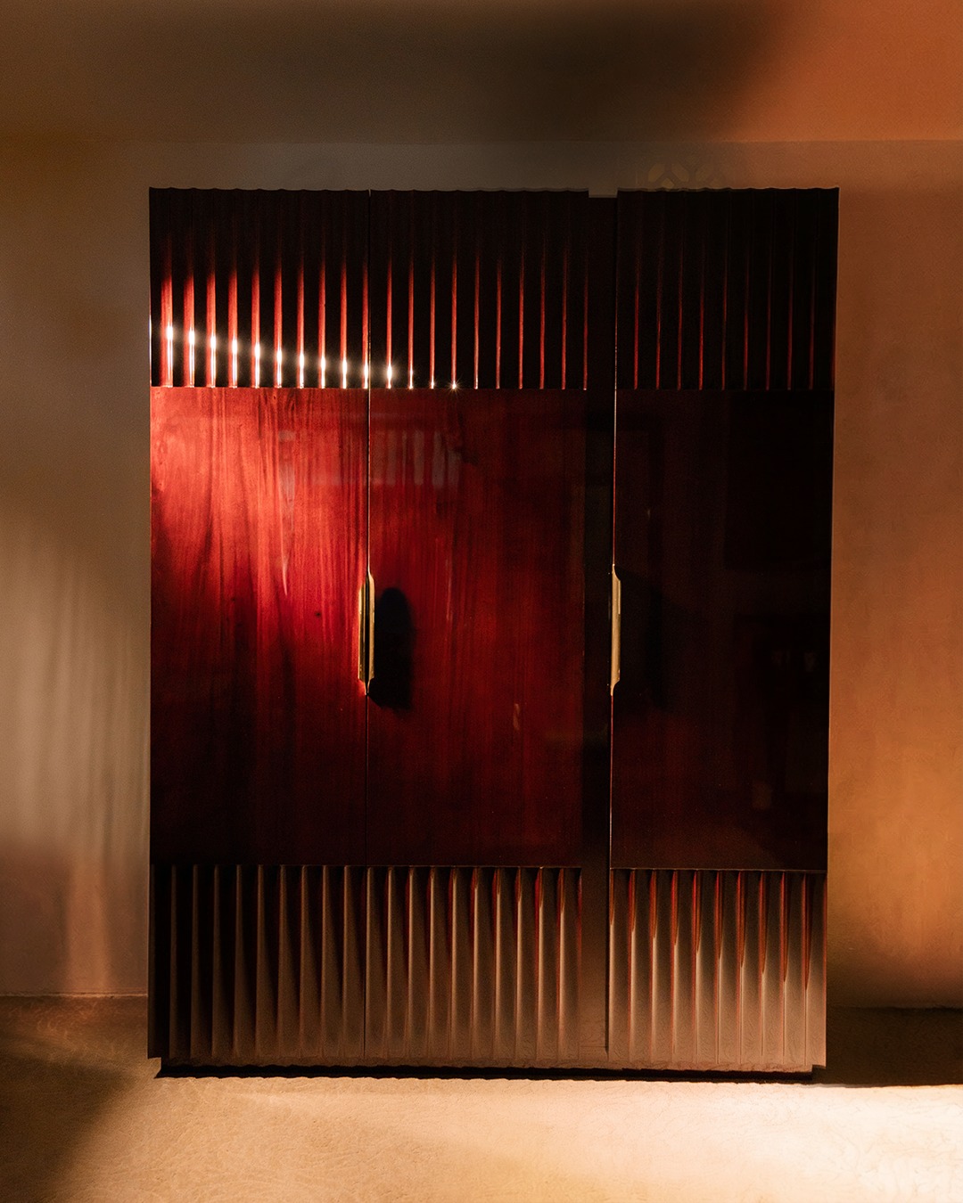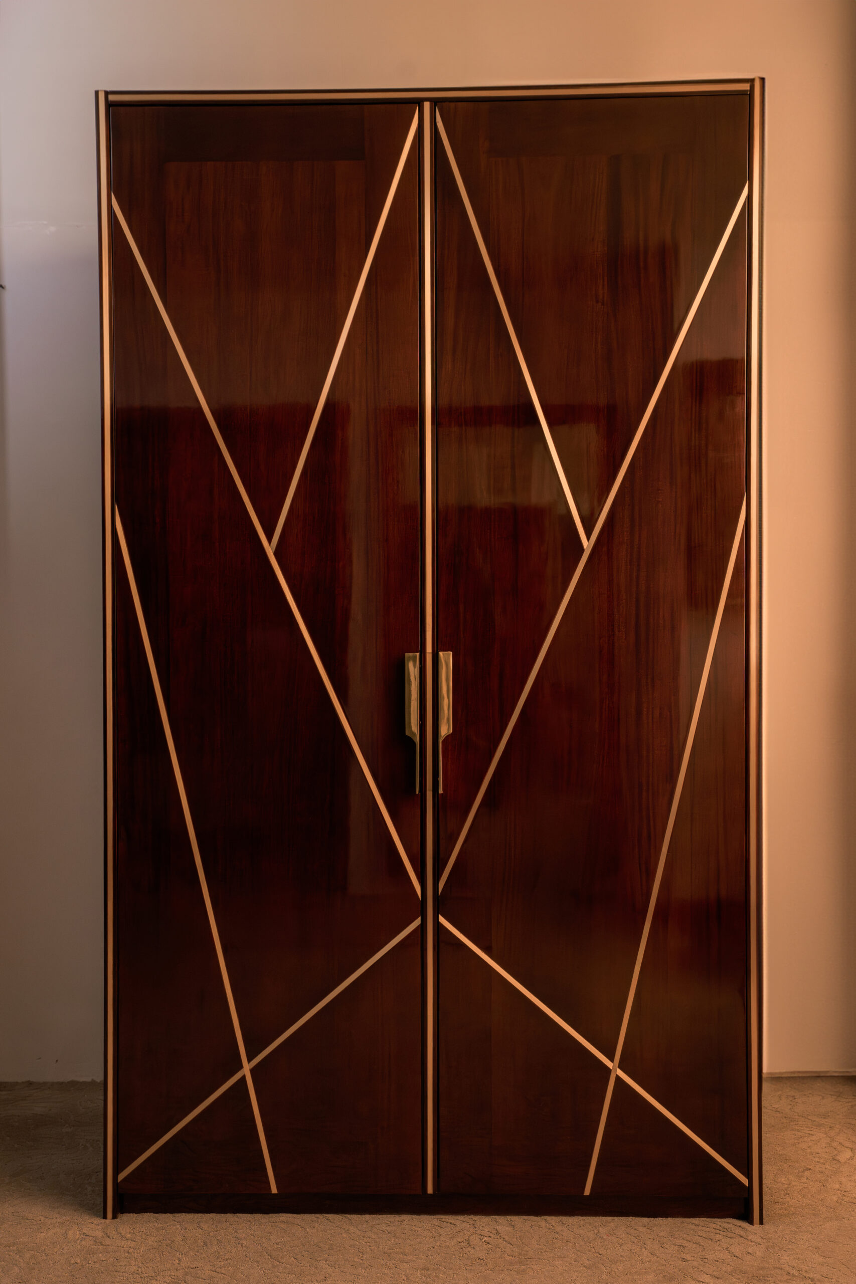 This exquisite wardrobe stands out as an art décor masterpiece with innovative fabric panelling on its doors and solid brass trimmings on its handles.